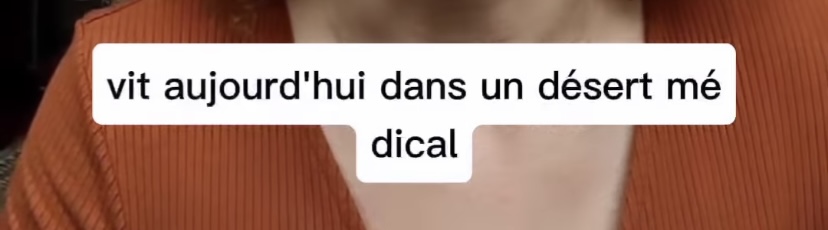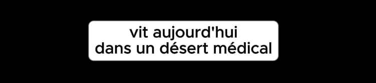 Sous-titrage noir avec un bandeau blanc en 2 lignes. Première ligne : "vit aujourd'hui" Deuxième ligne : "dans un désert médical"
